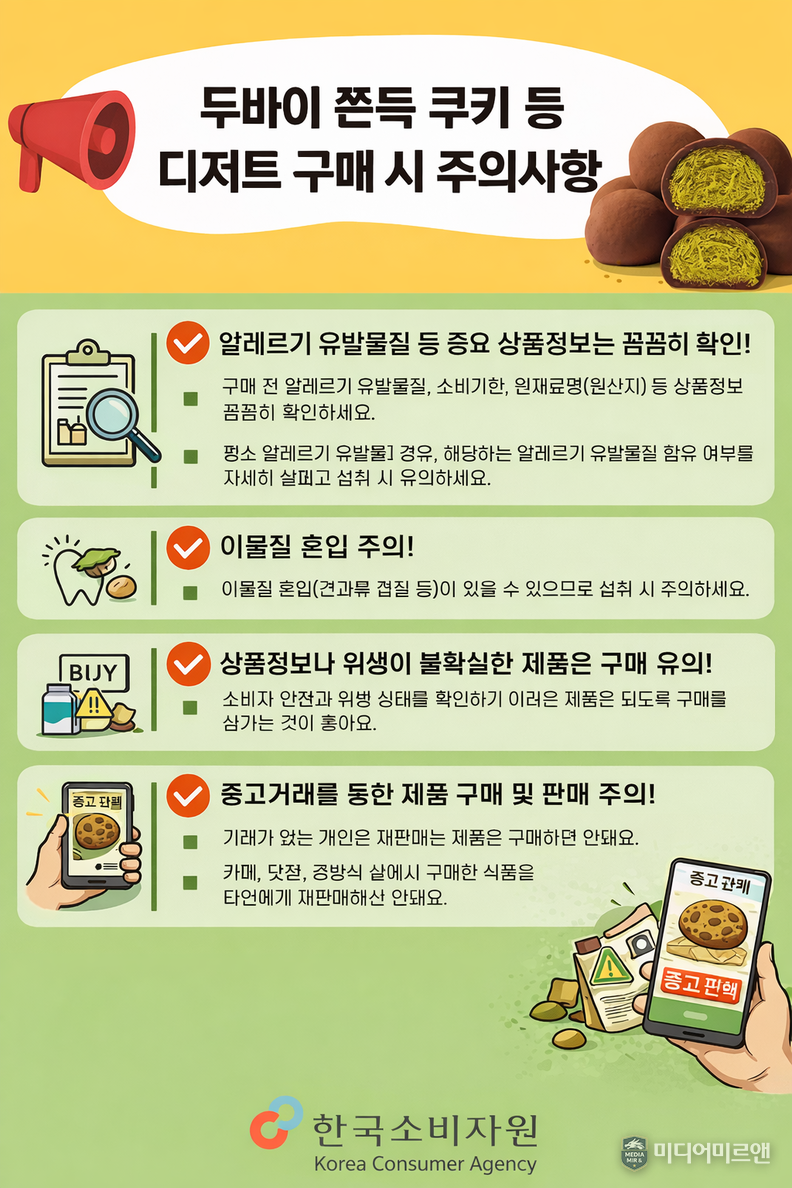 미디어미르앤 김정기 기자 | 한국소비자원이 최근 유행하는 ‘두바이 쫀득 쿠키’와 관련해 올해 1~2월 소비자위해감시시스템(CISS)에 접수된 위해정보 23건을 확인하고 8일 소비자안전주의보를 발령했다.