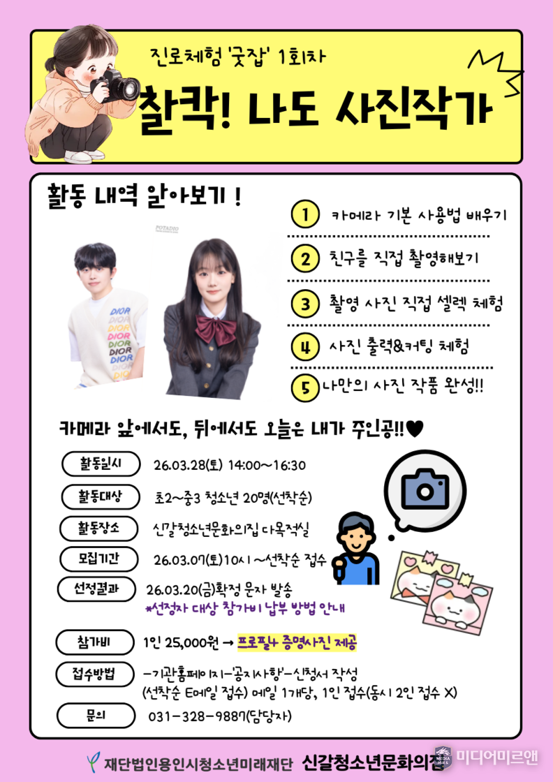 미디어미르앤 김재겸 기자 | 신갈청소년문화의집이 오는 28일 청소년 대상 사진작가 직업체험 프로그램 ‘굿잡(Good Job)’ 1회차를 운영한다.