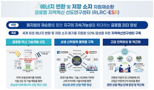 조선대학교는 조홍현 교수를 중심으로 지역혁신 선도연구센터를 구축하고, 에너지 변환 및 저장 소자에서 발생하는 폐기물의 자원화 50% 달성을 목표로 ▲에너지 변환·저장 폐소자 자원화 기술 개발 ▲폐소자 재사용 진단 및 재활용 기술 개발 ▲처리공정 소비에너지 활용 고도화 기술 개발 등 3개 연구그룹으로 기술 개발을 수행한다.