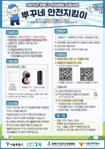 '뿌꾸네 안전지킴이'는 강북구 1인가구의 안전한 생활환경 조성을 목표로 범죄 예방에 효과적인 안심장비 2종을 무상 지원하는 사업이다. 신청자는 현관문 안전장치와 함께, 스마트 초인종 또는 가정용 CCTV 중 1종을 선택해 총 2종의 안심홈세트를 지원받을 수 있다.