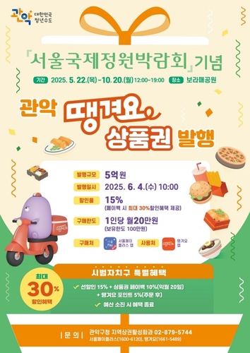 앞서 구는 지난 1월, 5억 원 규모의 관악땡겨요상품권을 발행해 발행 6일 만에 완판하는 성과를 기록했다. 구는 서울국제정원박람회 기념 땡겨요 상품권 추가 발행으로 지역 상권에 활력을 더할 것으로 기대한다.
