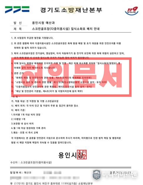 소방서에 따르면 지난 3일 용인 지역 다중이용시설(스크린골프장) 업주들에게 질식소화포 구매를 유도하는 공문이 발송됐다. 해당 공문은 경기도소방재난본부와 용인시청 예산과 명의를 도용한 것으로 확인됐다.