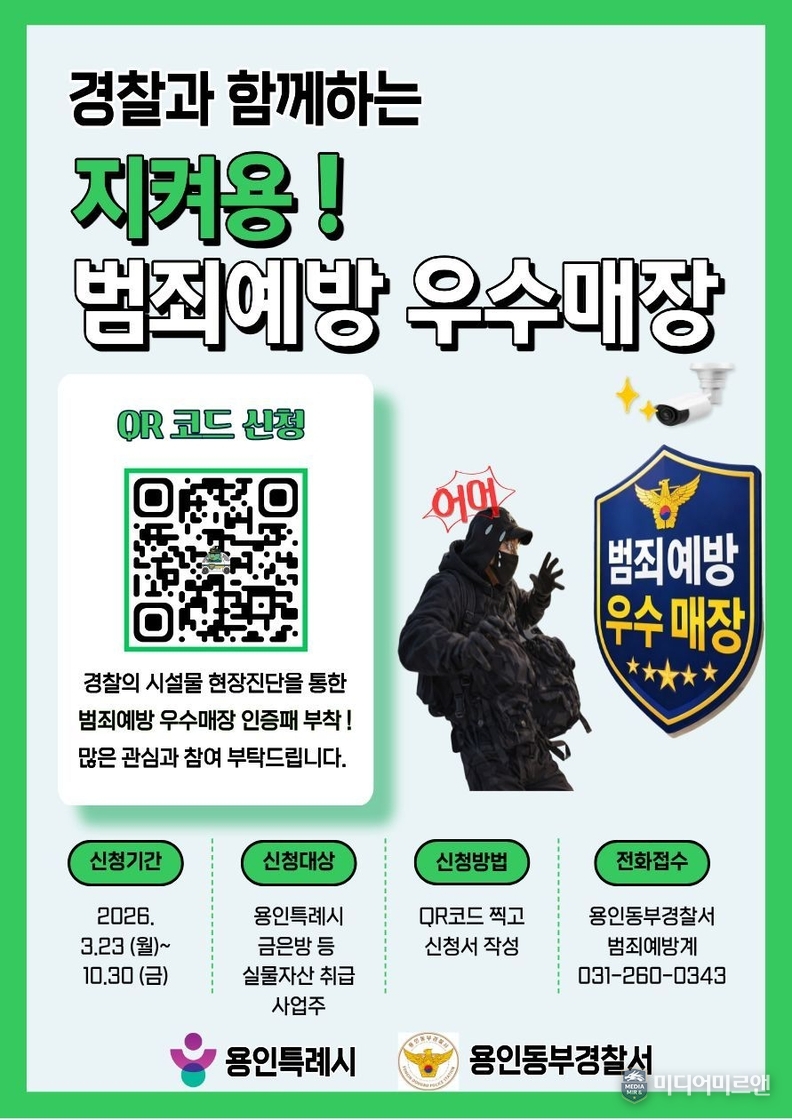 미디어미르앤 김정기 기자 | 용인동부경찰서가 10월 30일까지 금은방 등 실물자산 취급업소를 대상으로 ‘지켜용 범죄예방 우수매장 지정 사업’ 신청을 받는다. 방범시설 기준을 충족한 업소에는 현장 진단을 거쳐 인증패를 부착할 예정이다.