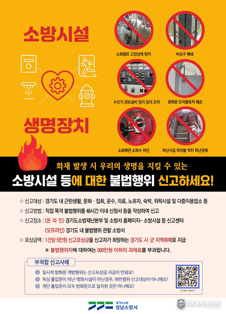 미디어미르앤 김재겸 기자 | 성남소방서가 화재 시 인명피해를 줄이기 위해 소방시설과 방화시설 불법행위를 신고하면 포상금을 지급하는 ‘소방시설 등 불법행위 신고포상제’를 운영하고 있다고 10일 밝혔다.